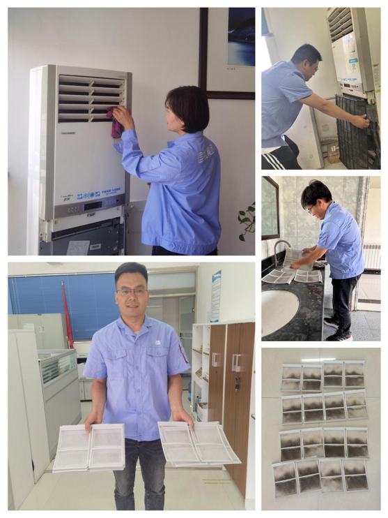 在活動現(xiàn)場,志愿者們分工明確,配合密切,拆卸空調(diào)外殼、清洗空調(diào)濾網(wǎng)、擦拭空調(diào)外機(jī),經(jīng)過一下午有條不紊的清洗活動,辦公室和會議室的空調(diào)從內(nèi)到外煥然一新?!皼]想到空調(diào)濾網(wǎng)這么臟”“太好了,終于能放心開空調(diào)了”,看著沖洗出的灰塵污漬,員工們對志愿者助人為樂、無私奉獻(xiàn)的精神紛紛表示感謝和贊揚。