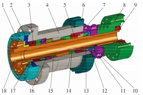 1-護套;2-前壓緊環(huán);3-前軸承;4-軸承座;5-后軸承;6-后鎖緊螺母;7-后端蓋;8-驅動帶輪;9-帶輪鎖緊螺母;10-編碼器帶輪;11-后緊定螺母;12-后壓蓋;13-后壓緊環(huán);14-后調(diào)整環(huán);15-前緊定螺母;16-角接觸軸承組;17-前調(diào)整環(huán);18-主軸。