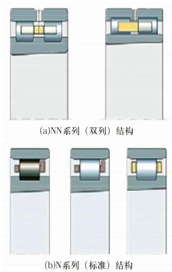 成對組配或多聯(lián)組配角接觸球軸承如圖8所示,在應用安裝時必須施加一定的預載荷。選擇適當?shù)念A載荷可以提高主軸系統(tǒng)剛性,降低溫升,改善系統(tǒng)加工精度。軸承預載荷通常分為輕(A)、中(B)、重(C)3檔,用戶可根據(jù)主軸系統(tǒng)的實際工況進行選擇。單、雙列圓柱滾子軸承的結構如圖9所示。雙向推力角接觸球軸承如圖10所示,通常要求SP等級公差,有需要時也可要求UP等級公差。