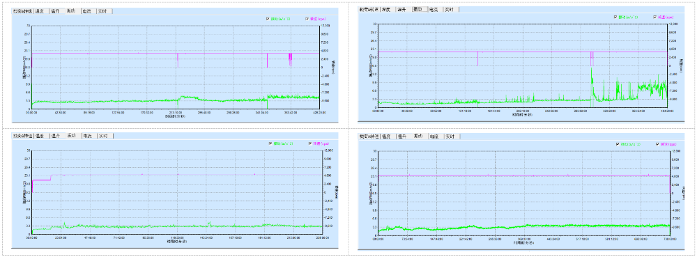 對(duì)整個(gè)試驗(yàn)工裝的振動(dòng)情況進(jìn)行記錄,對(duì)每一時(shí)刻的振動(dòng)值進(jìn)行記錄,在整個(gè)測試中的振動(dòng)趨勢變化可以全程跟蹤軸承的狀態(tài),是否出現(xiàn)異常以及異常的趨勢變化,分析軸承在測試中哪一階段開始出現(xiàn)異常,是否出現(xiàn)打滑等狀況;