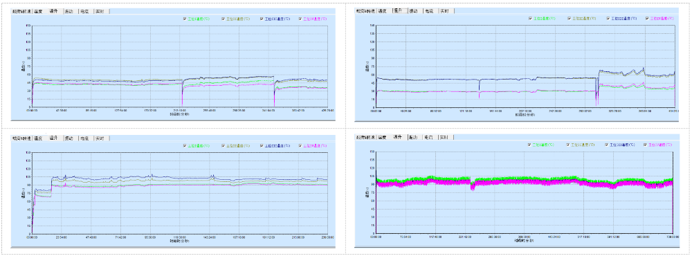 在測試中,對(duì)每套軸承的溫度、溫升進(jìn)行逐一監(jiān)控,進(jìn)行詳細(xì)記錄每套軸承在每個(gè)時(shí)間點(diǎn)的溫度狀況,對(duì)整個(gè)測試的溫度變化形成趨勢,是否形成異常高溫等;