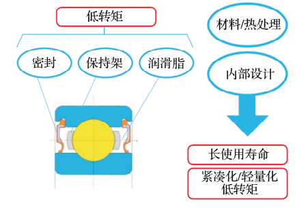 通過材料、熱處理、內(nèi)部設(shè)計(jì)參數(shù)的變化以及諸如密封、保持架、潤(rùn)滑脂的改進(jìn)(圖1),實(shí)現(xiàn)低轉(zhuǎn)矩的要求和緊湊化、輕量化的設(shè)計(jì)。