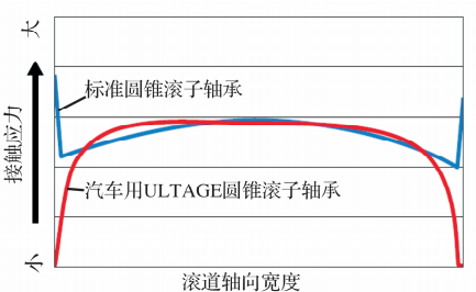 圓錐滾子軸承滾動(dòng)接觸區(qū)域的接觸應(yīng)力最小化,并在滾子上采用特殊凸形減小接觸區(qū)域邊緣處過大的應(yīng)力(邊緣載荷)。滾道軸向截面接觸應(yīng)力分布計(jì)算示例如圖8所示。隨著ULTAGE圓錐滾子軸承在汽車上的應(yīng)用,通過采用特殊凸形抑制接觸區(qū)域的邊緣載荷和均衡整體接觸應(yīng)力分布,提高軸承使用壽命。
